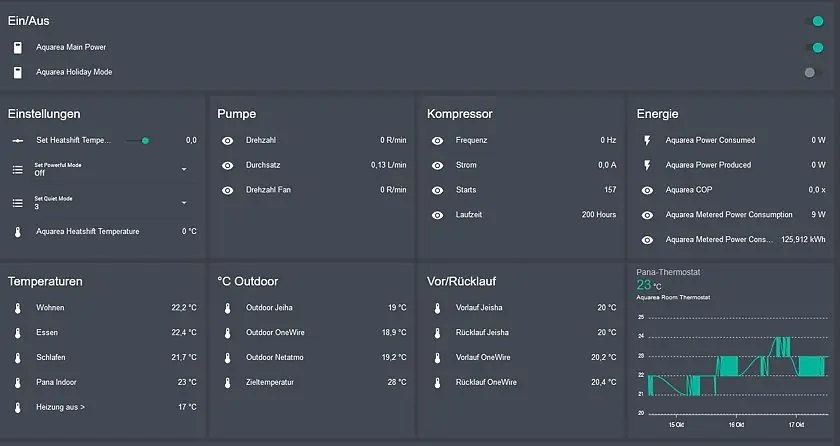 Ich hatte es bereits erwähnt, erst im Zusammenspiel mit einer Heimautomation wird das Ganze richtig interessant. Schon mal darüber nachgedacht? Nach früheren Versuchen mit FHEM habe ich nun Home Assistant im Einsatz. Hier bspw. eines meiner Dashboards für die Jeisha: